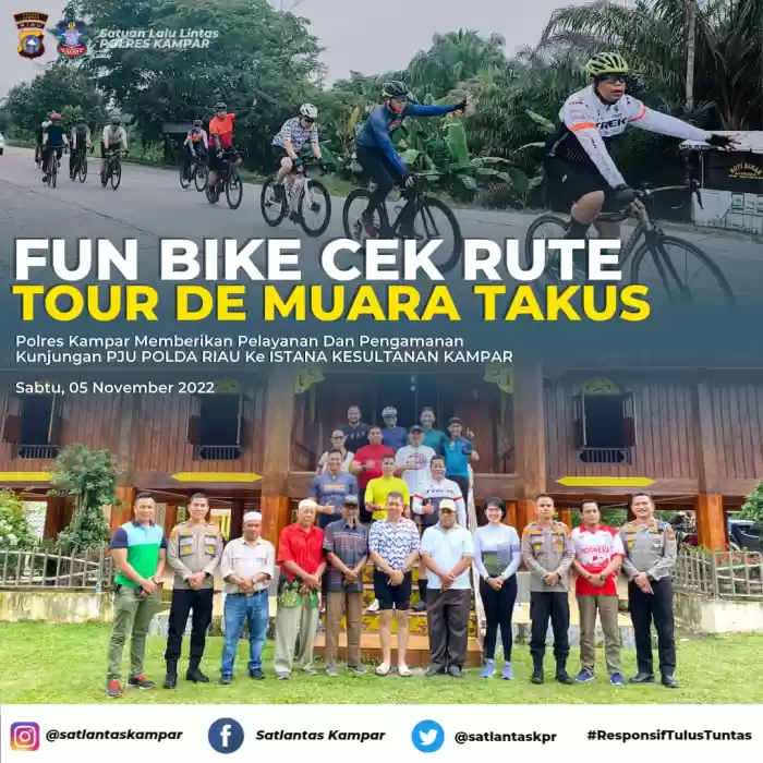 KAMPA-Para Irwasda Polda Riau bersama para PJU (pejabat utama) Polda Riau, Kapolres Pekanbaru, Perwakilan ISSI Riau dan rombongan melakukan Uji coba lintasan Tour De Muara Takus 2022 sampai Pit Stop 1 Istana Kesultanan Kampa di Desa Koto Perambahan, Kecam